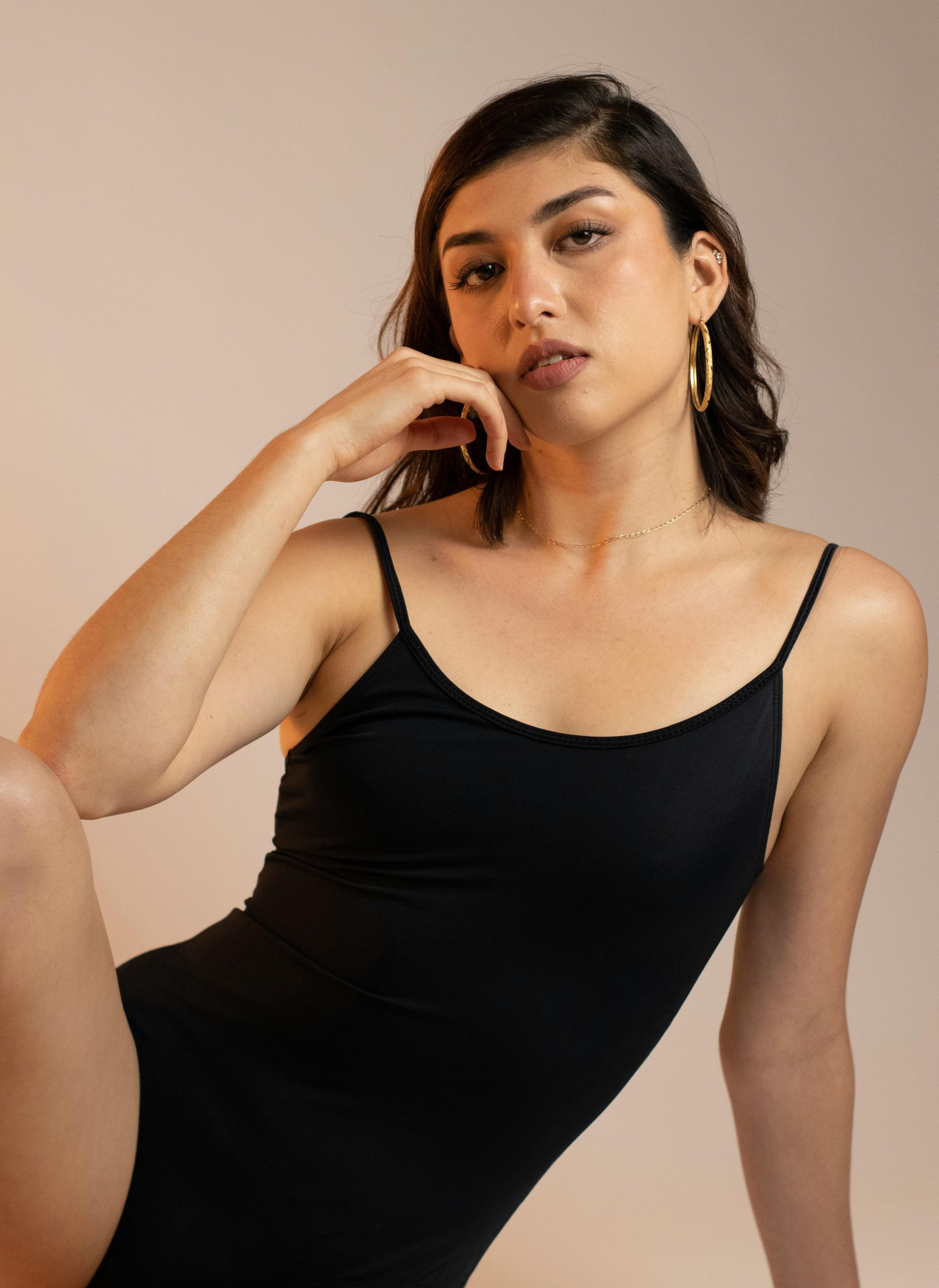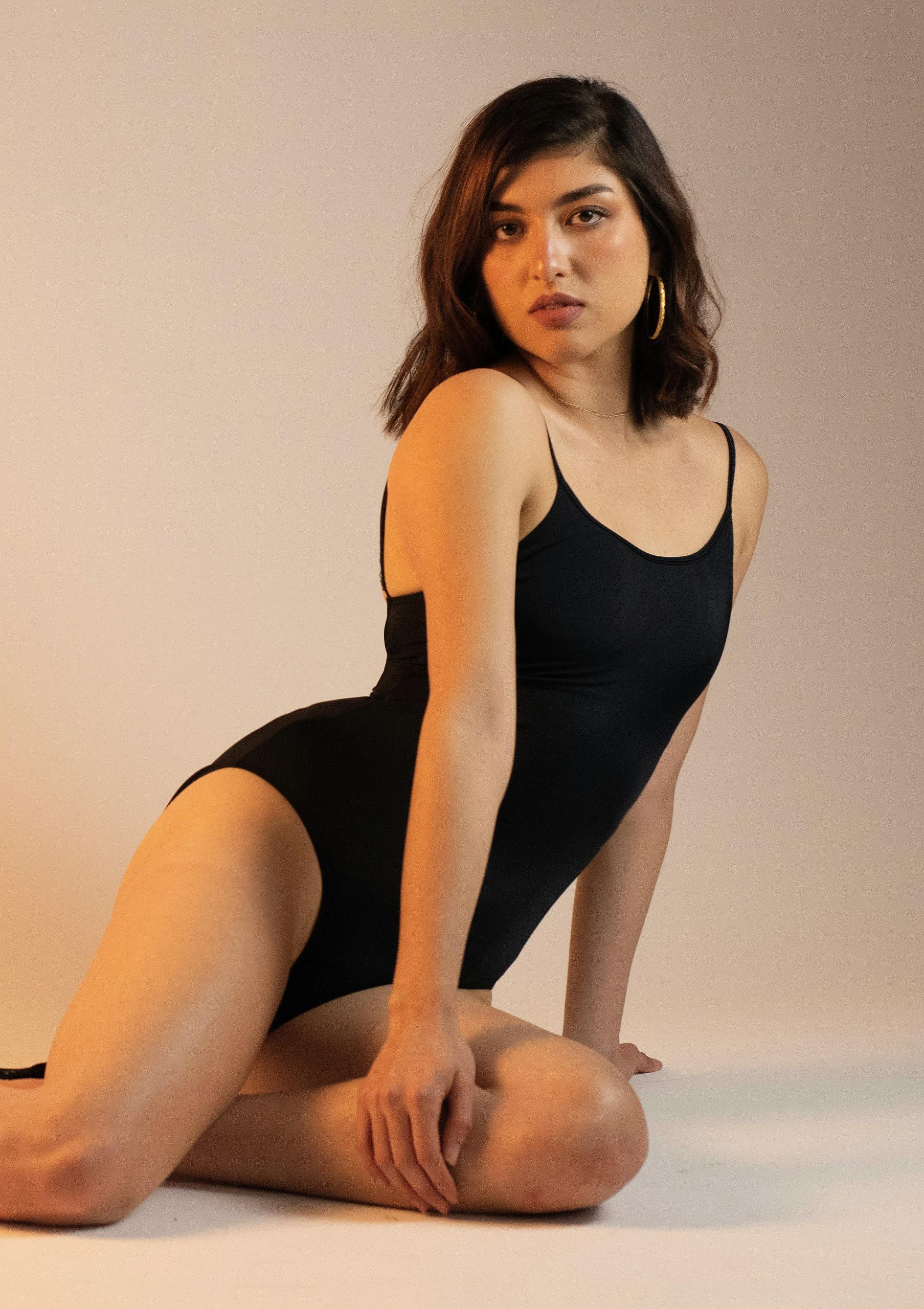 This chic black swimsuit offers a flattering, elegant design and a comfortable fit for all your swimming needs.